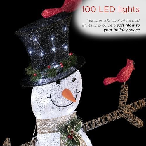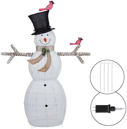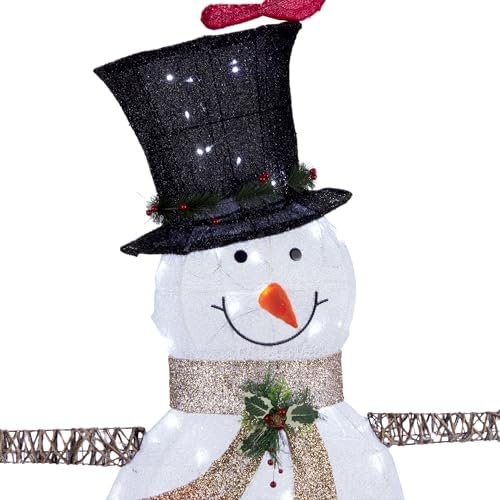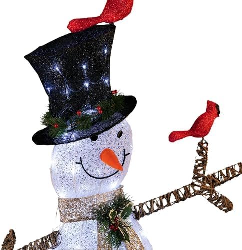 Thanks to its weather-resistant build, the Alpine Corporation 74″ (Over 6 Feet Tall) Outdoor Mesh Snowman Yard Decor with Red Birds and 100 Cool White LED Lights, Christmas Holiday Lighted Sculpture is well suited for outdoor displays, yet versatile enough for indoor placement in spacious areas like foyers, event halls, or covered patios. Its balanced base helps keep the snowman upright and secure, allowing you to decorate with confidence.