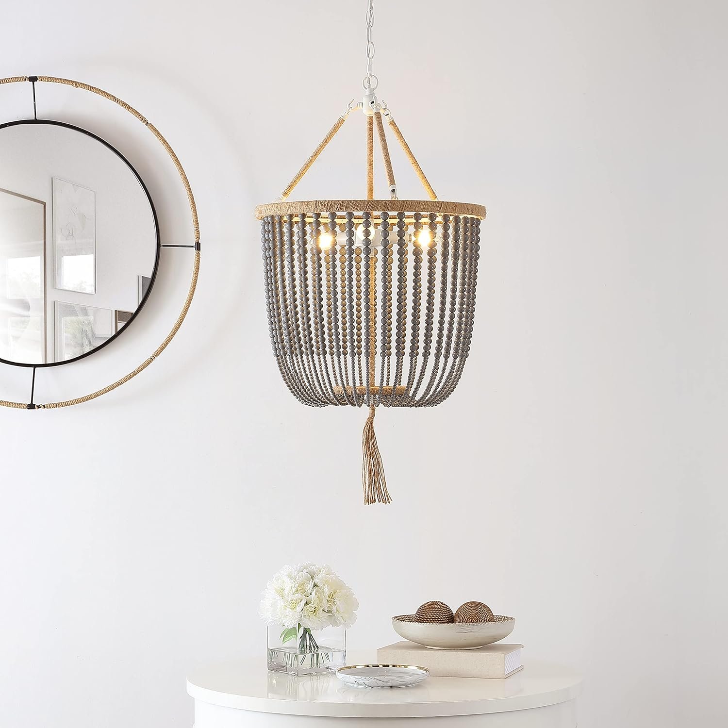 - Unique Grey Beaded Light Design: The SAFAVIEH Angie features strands of acrylic beads in a sculptural drum silhouette pendant with a tassel chandelier accent, marrying classic farmhouse lighting with relaxed boho aesthetics for a look that’s both eye-catching and versatile.