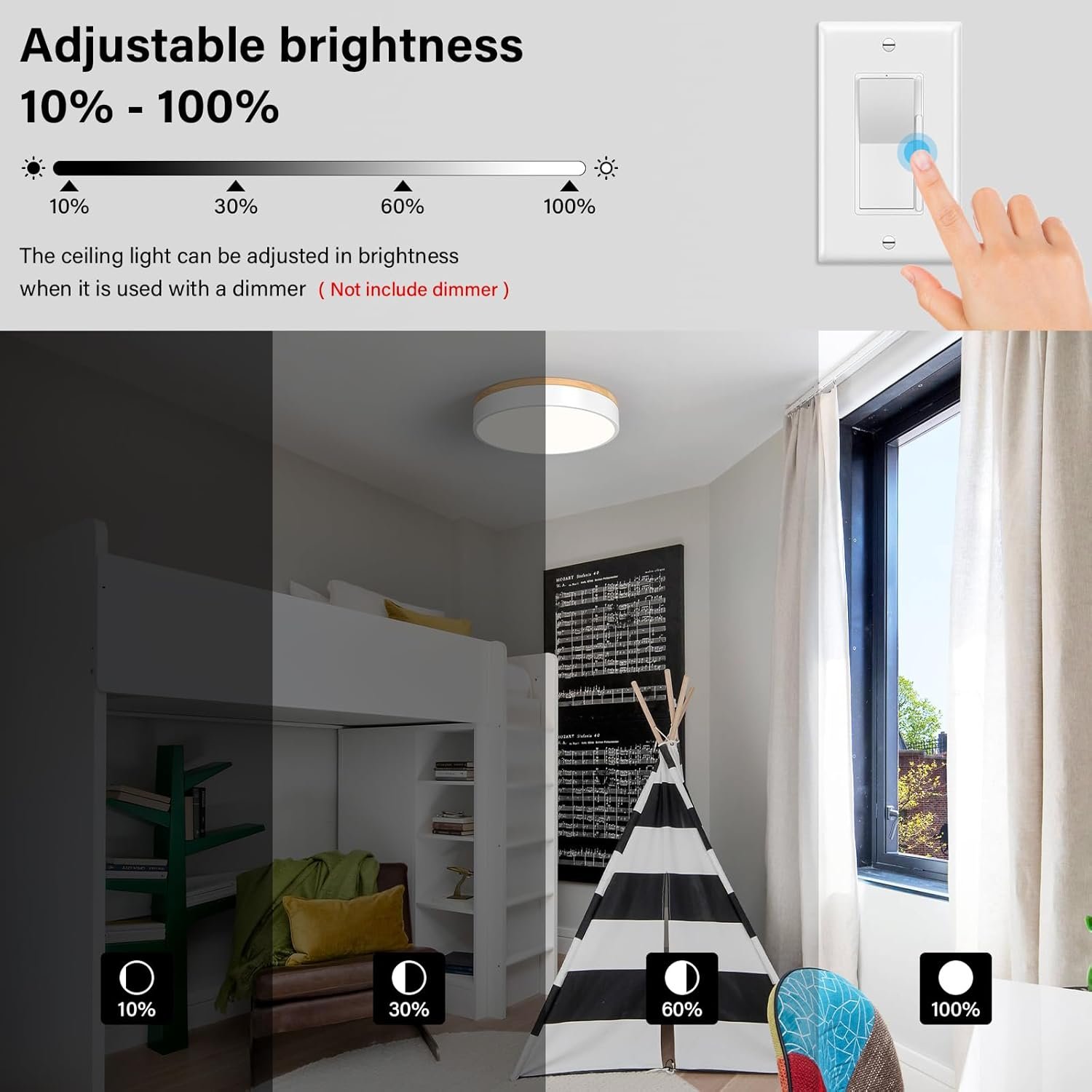 A: The built-in switch allows you to select from five different color temperatures before installation, so you can match the ceiling light hue to your room’s décor or your mood. This makes it both flexible and functional as a bedroom fixture or kitchen ceiling light option.