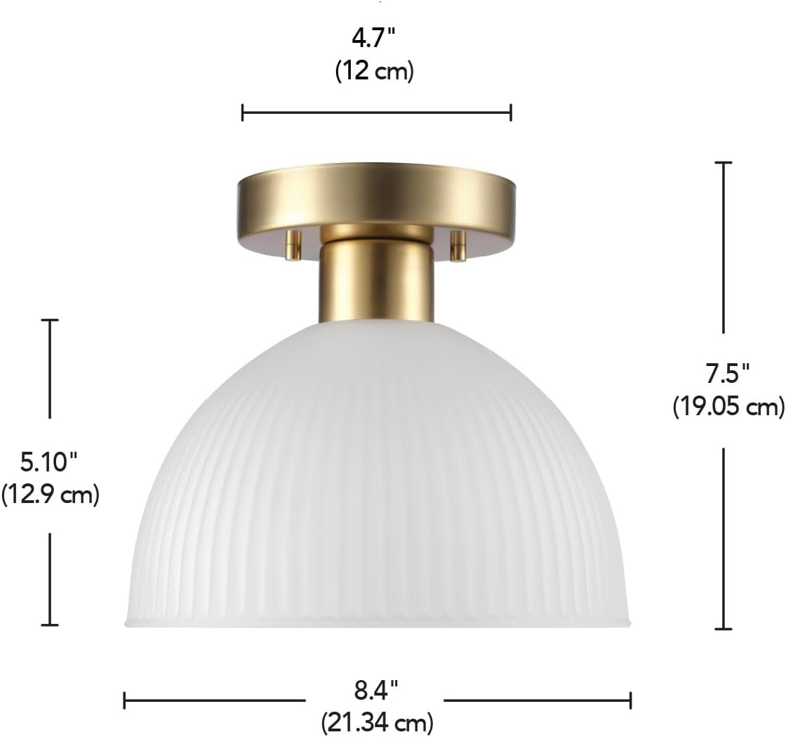 - Measurements & Materials: At just 8.4″ wide and 5.10″ high, this semi-flush mount is made of durable metal with a stunning matte brass finish.