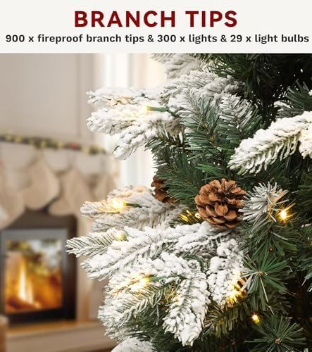 The DWVO Christmas Artificial Decoration with Remote-Controlled Lights inspired by the Christmas Tree 6ft, Full Natural Green Alaska Pine with Snow, 29 Pine Cones and 300 LED Lights, Xmaxs Artificial Trees with 900 Hinged Branch Tips & Stand Decoration Remote Controlled is a modern and practical holiday décor solution designed to enhance both indoor and outdoor spaces with festive elegance and effortless functionality.