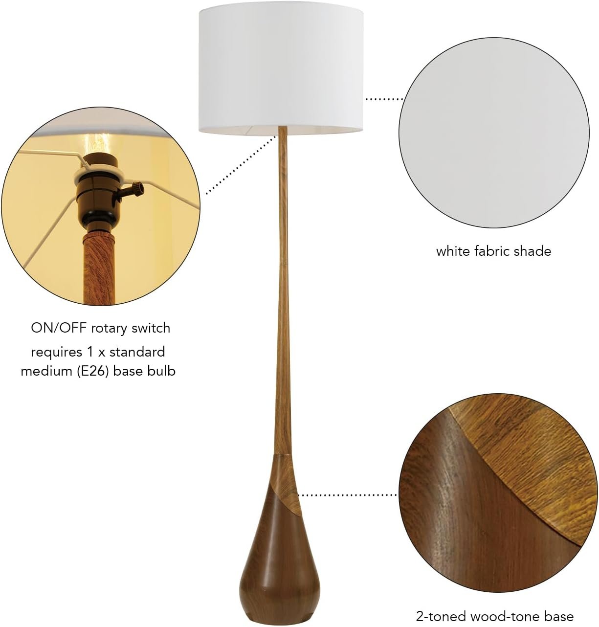 - Refined Rustic & Contemporary Lighting: The teardrop silhouette and two-tone lamp base combine a faux wood aesthetic with contemporary lighting finesse, suiting both modern floor lamp enthusiasts and lovers of rustic design.