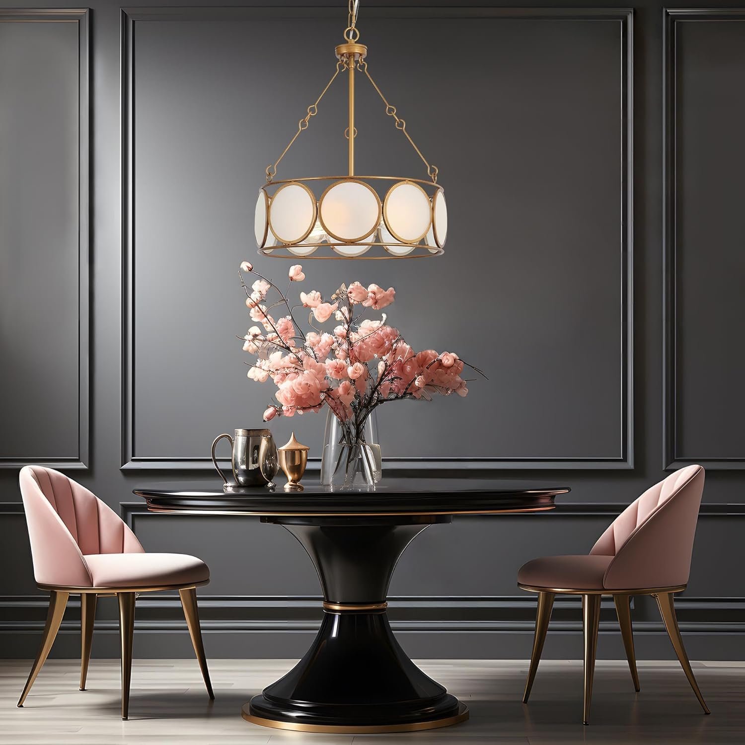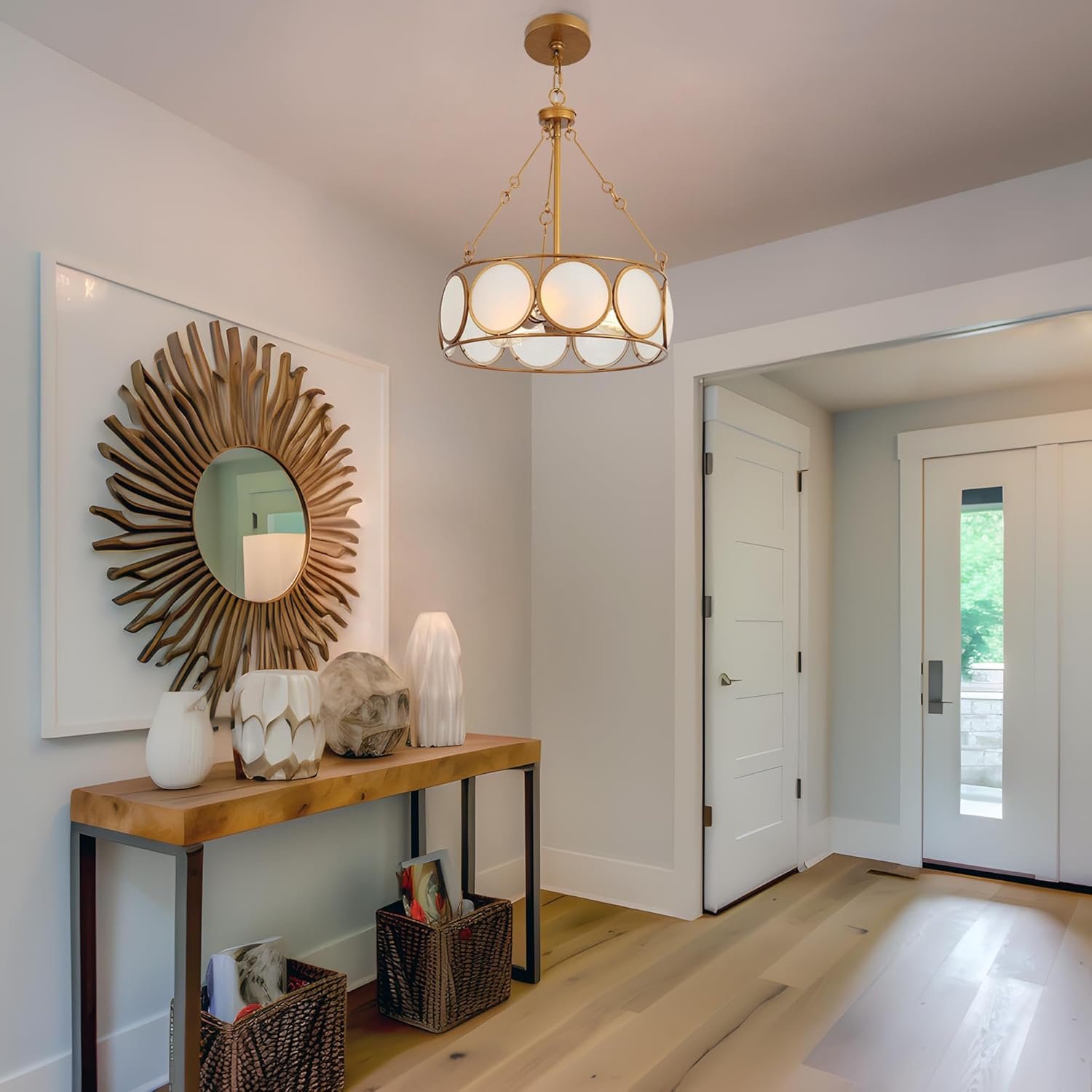 - Distinctive Drum Pendant & Frosted Glass Chandelier: Featuring a unique drum design with frosted glass plate accents, this gold chandelier exudes modern farmhouse charm while delivering gentle, ambient light ideal as an entryway light fixture or living room pendant.