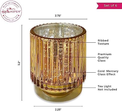 Vintage Design of the Kate Aspen Gold Votive Candle Holders – Vintage Ribbed Glass Candle Holder Set of 6 – Mercury Glass Tealight Holders for Christmas Table Decor, Holiday Centerpieces, Fall Thanksgiving Tablescape