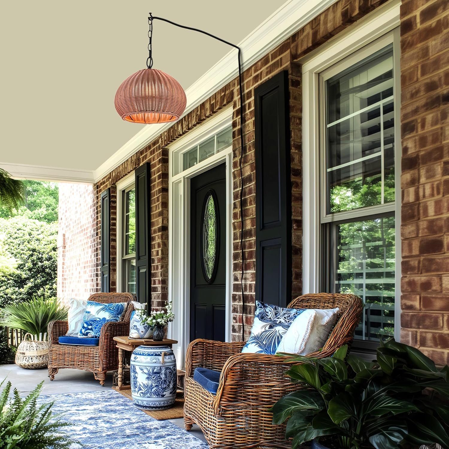 • True Weather Resistant Performance: Designed for light wind, sun, and even mild rain, this outdoor pendant features a plastic rattan shade with a frosted inner layer and a robust bronze hanging chain light. It’s damp-rated, so you can hang it on a covered porch or patio with confidence (see manufacturer).