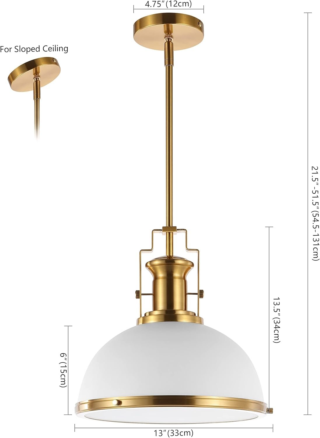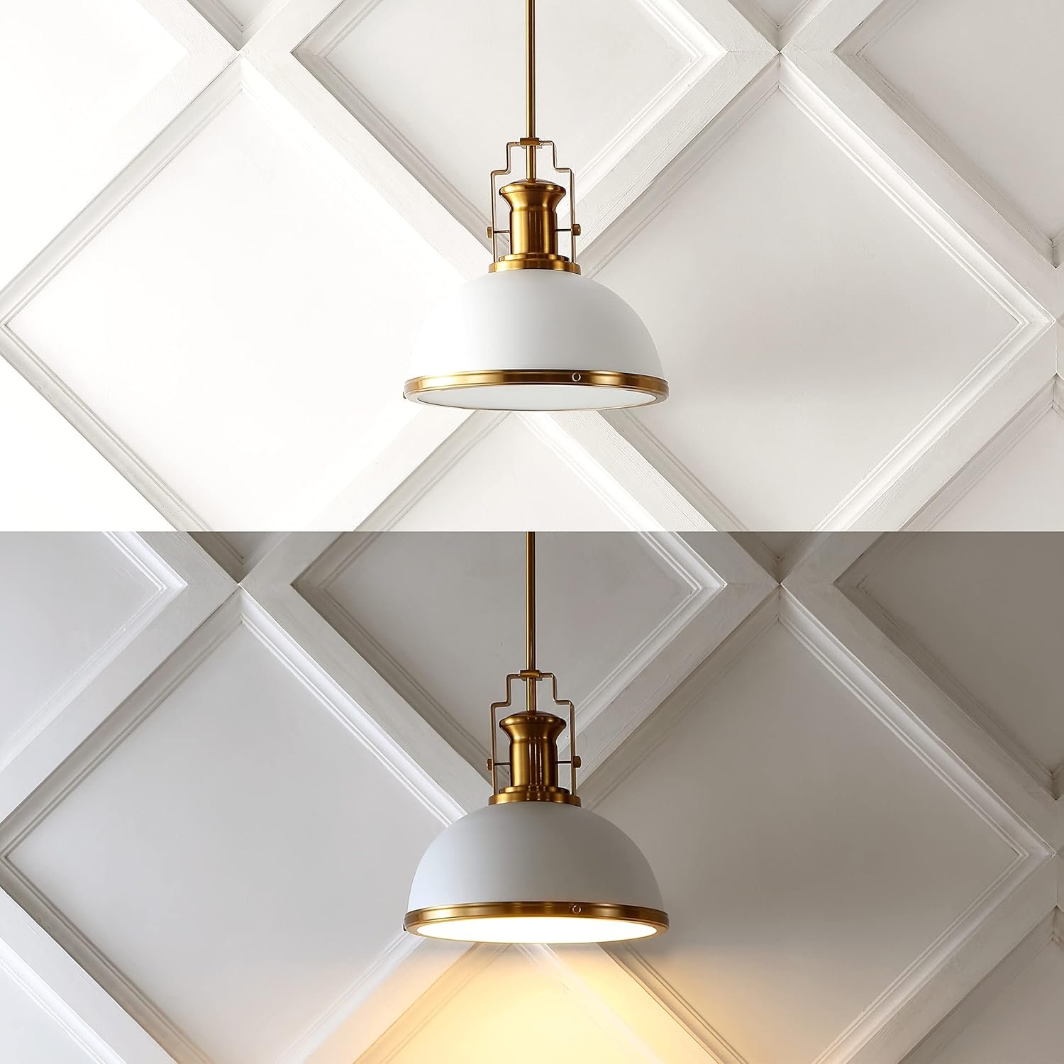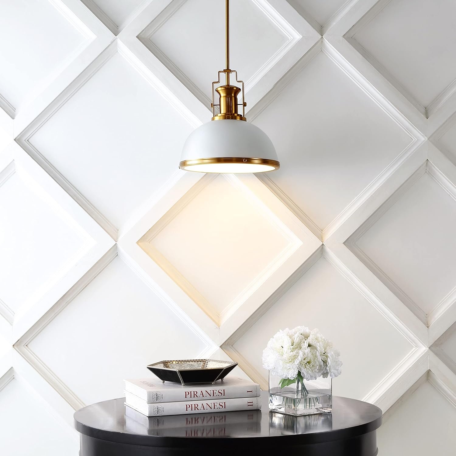 The JONATHAN Y 10" Brass Gold/White Modern Industrial Iron LED Dome Pendant Light elevates any kitchen island or entryway with its high-quality construction, adjustable design, and included energy-efficient LED bulb. Designed in New York with meticulous attention to detail, this fixture delivers a stylish and affordable home update that meets top safety standards.
