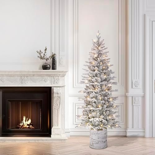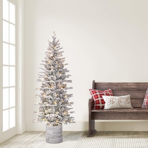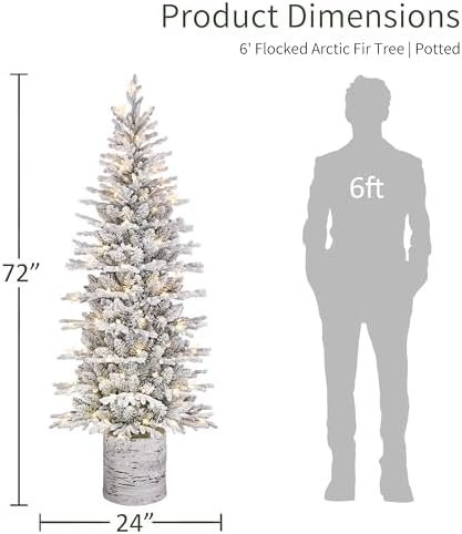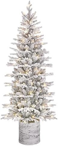 The Puleo International 6ft Pre-Lit Potted Flocked Arctic Fir Pencil Christmas Tree with 120 Warm White Lights is an exceptional artificial Christmas tree designed to bring festive charm, convenience, and elegance into any home or office. With its narrow pencil silhouette, it fits effortlessly into small living rooms, hallways, apartments, and cozy decorative spaces while still offering the height and beauty of a traditional Christmas tree.