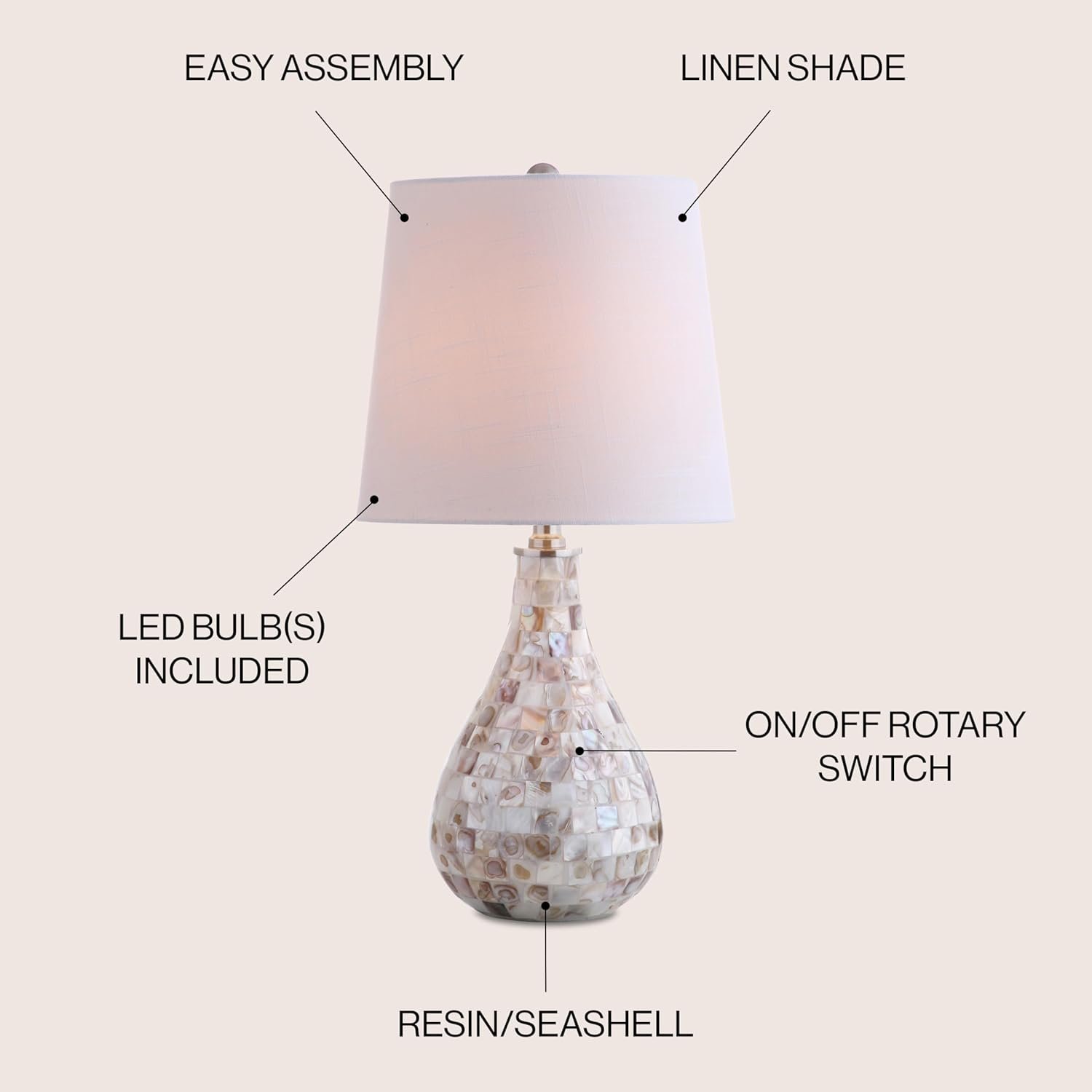 JONATHAN Y JYL1024A Table Lamp delivers stylish coastal charm and energy-saving LED lighting, featuring luxurious seashell accents and a classic linen drum shade—perfect for elevating any room with reliable quality.