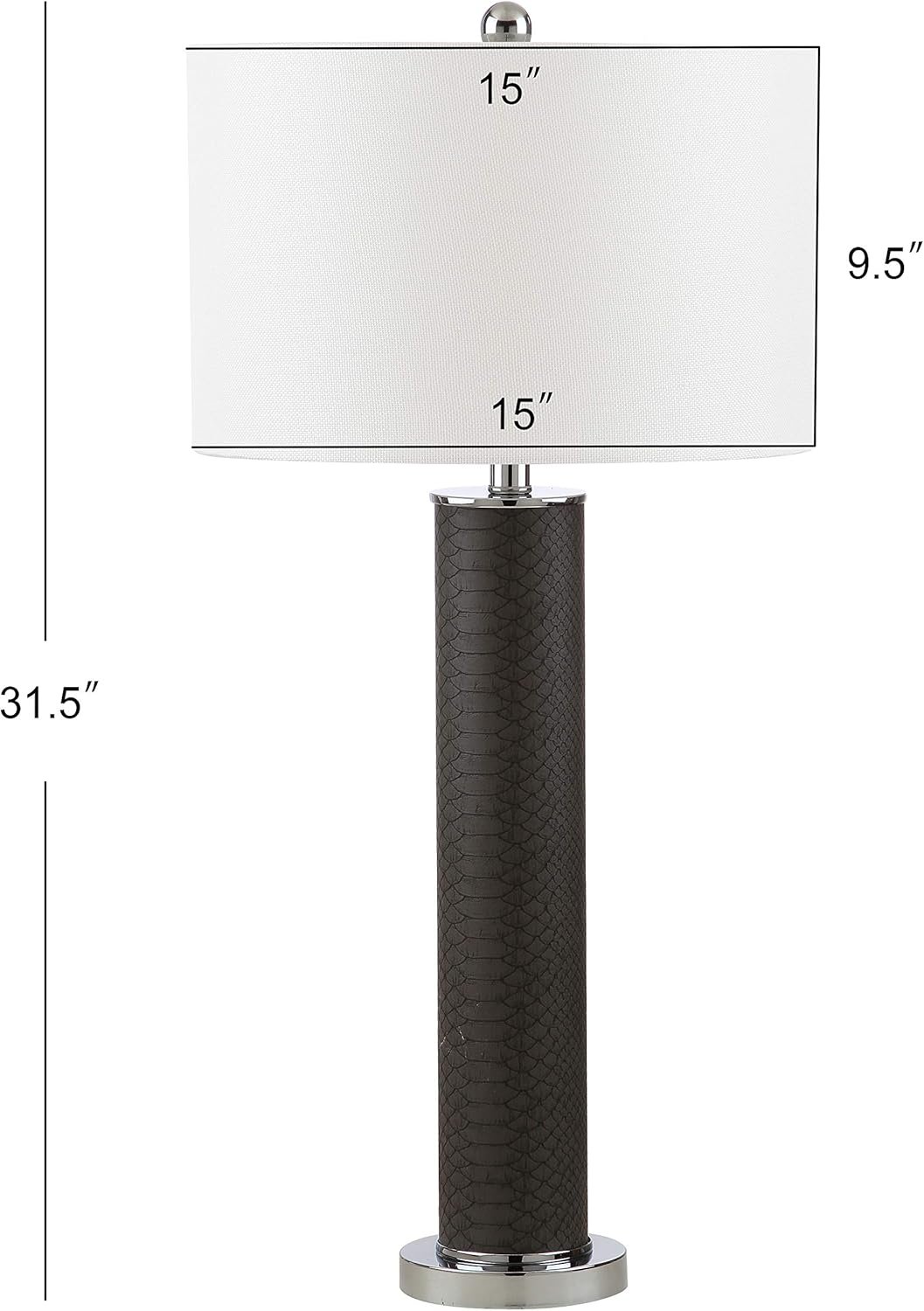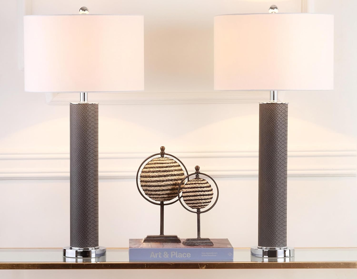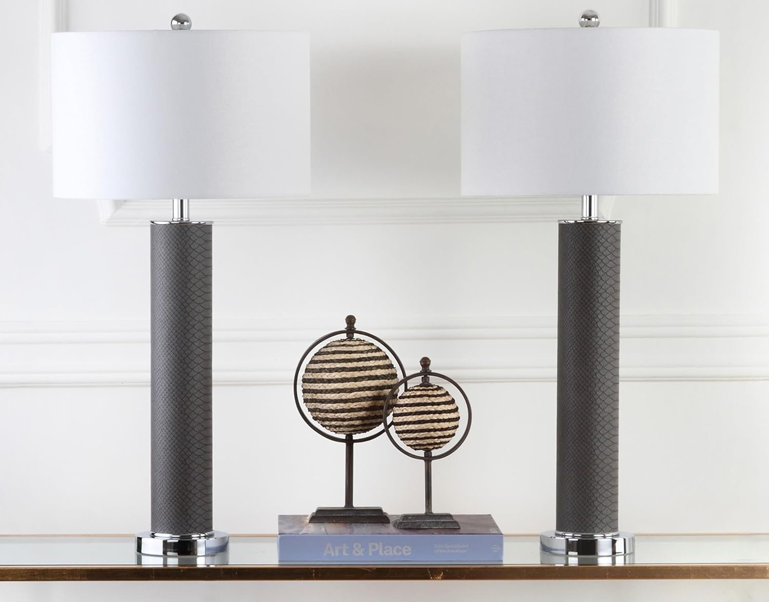 - Faux Leather Base with Snakeskin Texture: The cylindrical bases, crafted from polished metal and faux leather, boast a sophisticated grey faux snakeskin finish enhanced by chrome accents lamp details. It’s a texture you have to touch to believe, blending luxury with a subtle wild side.