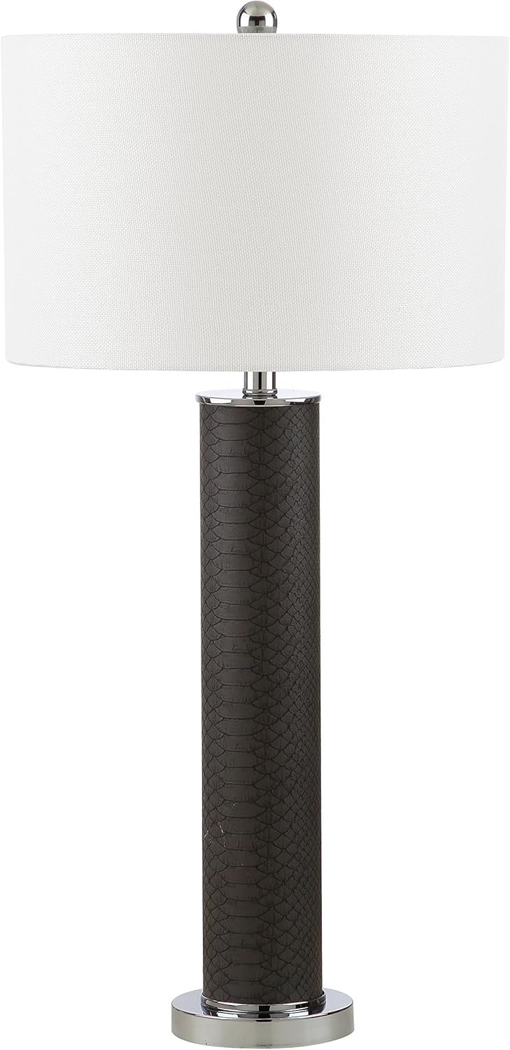 The SAFAVIEH Lighting Collection Ollie Table Lamps set features two stylish, modern lamps with grey faux snakeskin bases and polished chrome accents, perfect for adding a touch of luxury to any room. Energy-efficient LED bulbs are included, making these designer lamps from SAFAVIEH both practical and visually stunning for bedrooms, living rooms, or home offices.