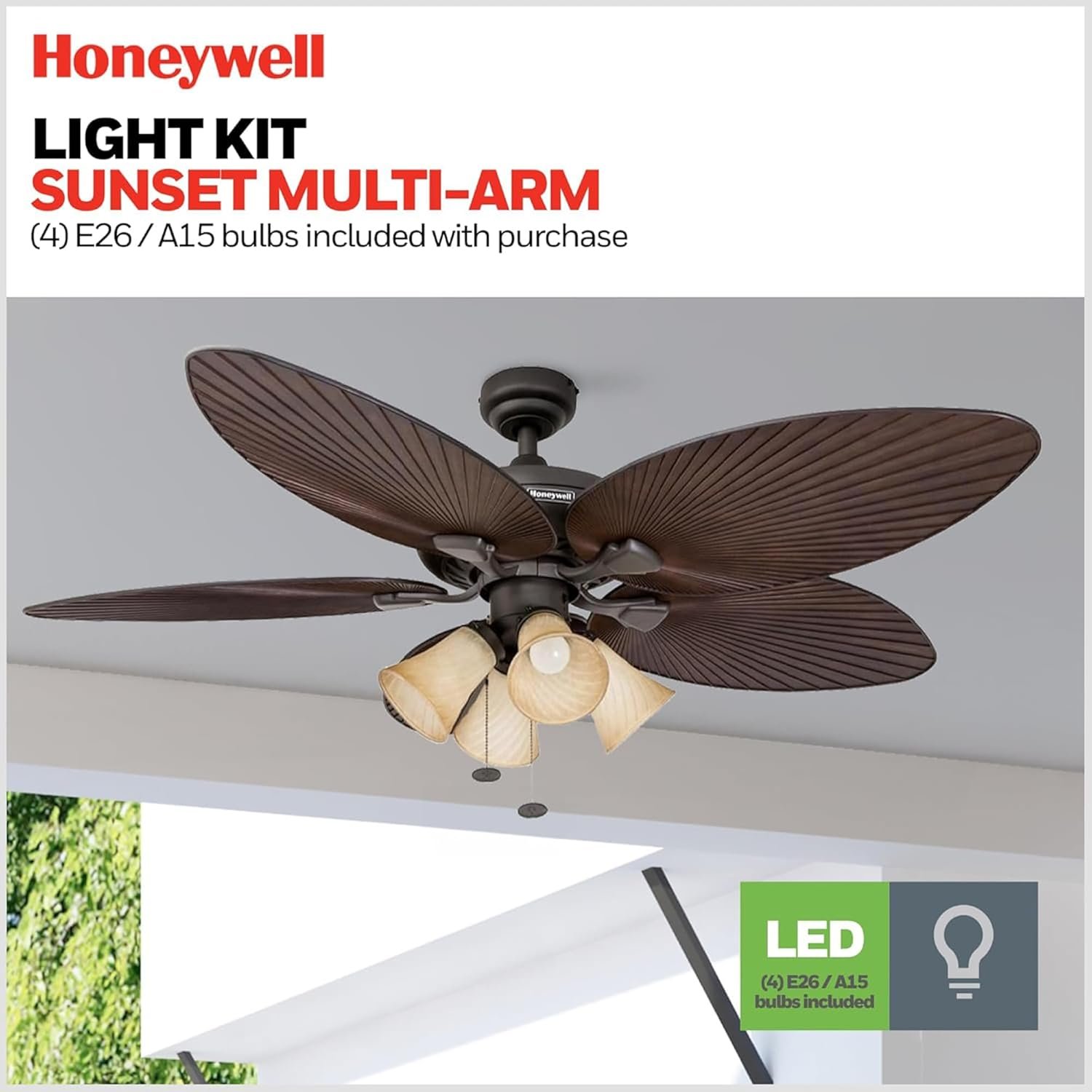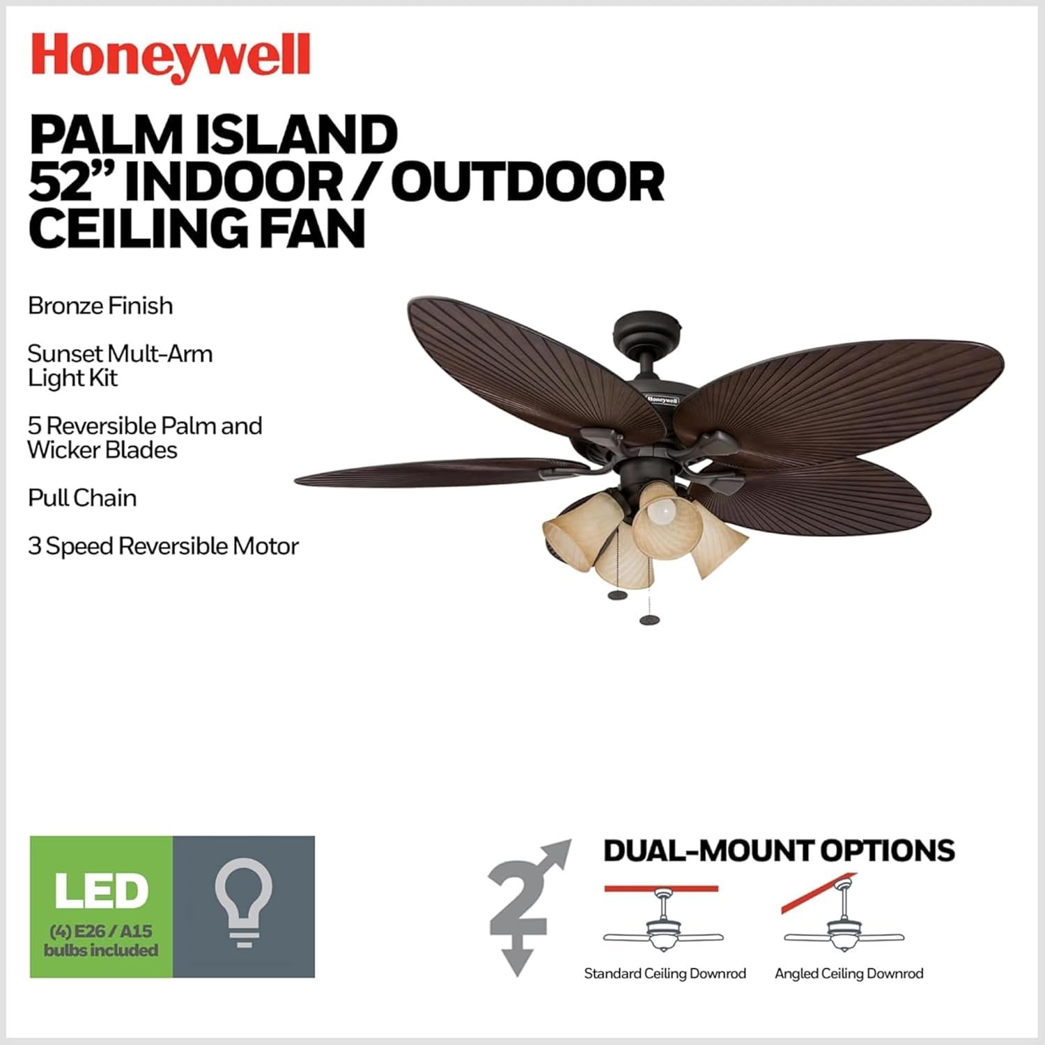 The Honeywell Palm Island 52 Inch Ceiling Fan delivers quiet, reliable airflow and tropical style for indoor or covered outdoor spaces, featuring durable all-weather blades, LED light, and versatile installation options—perfect for rooms up to 400 sq. ft.