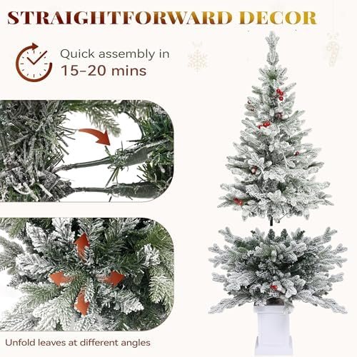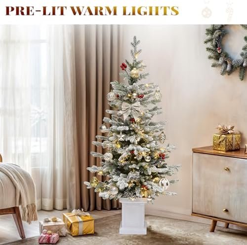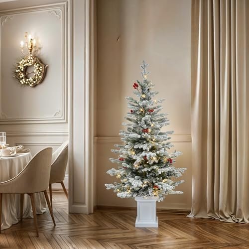 Why Choose the YITAHOME 4.5ft Potted Prelit Flocked Pencil Christmas Tree, Pre-Decorated Slim Arctic Fir with 358 PE & PVC Mixed Branch Tips and 100 Lights, 11 Pre-Decorated Red Berries for Home, Office Decoration